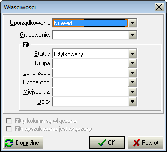 możemy zawęzić ewidencję do wyposażenia z wybranej Grupy, Lokalizacji lub Osoby odpowiedzialnej