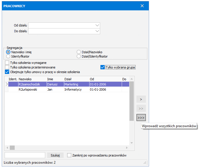 Od działu, Do działu - ukażą się tylko pracownicy z wybranego (wybranych) działów; jeśli pozycje pozostawimy puste, pokażą się wszyscy pracownicy