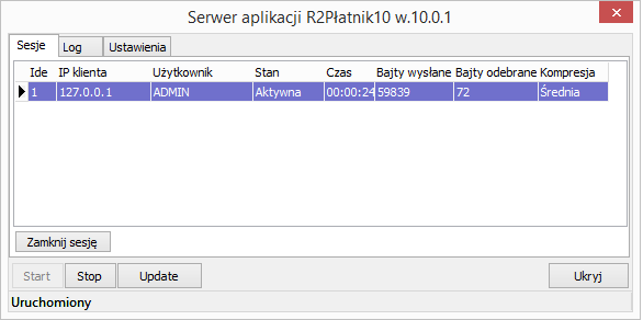 Okno serwera pokazuje aktualnie aktywne sesje. Przycisk Zamknij sesję zamyka dowolną działającą sesję.