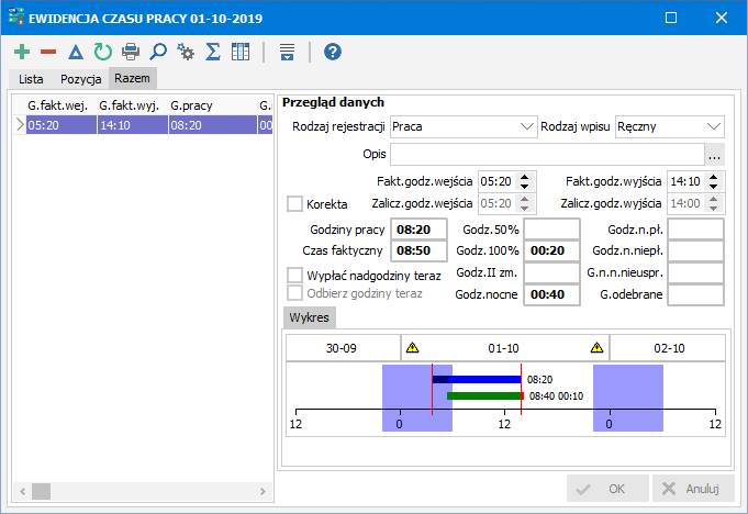 Przypadek 3. Pracownik przyszedł 20 min. za wcześnie i wyszedł 20 min. po nominalnym czasie. Zgodnie z założeniami godziny wejścia i wyjścia zostały zaliczone. Godziny pracy wynoszą (8:40). Zostały obliczone nadgodziny 100% (20 min.), ponieważ wypadają w porze nocnej - przed wejściem, oraz nagdodziny 50% po wyjściu (20 min.). Godziny nocne wyniosły (40 min.)