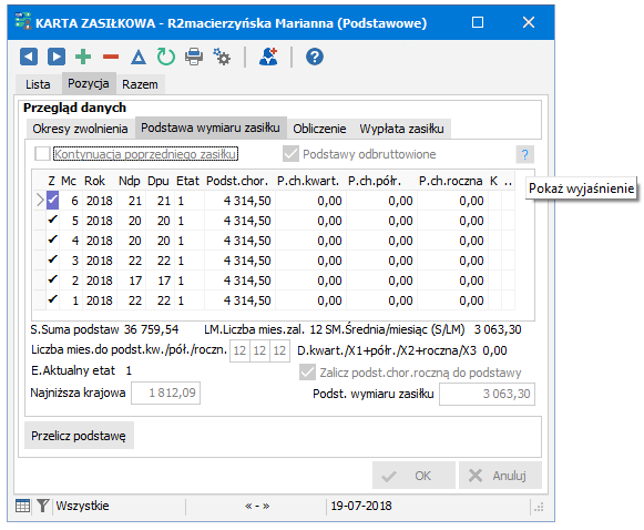 Przeglądamy zakładkę PODSTAWA WYMIARU ZASIŁKU, która wyliczana jest jako średnia z poprzednich 12 miesięcy wynagrodzeń (podstawy chorobowego) zgodnie z wytycznymi ZUS.